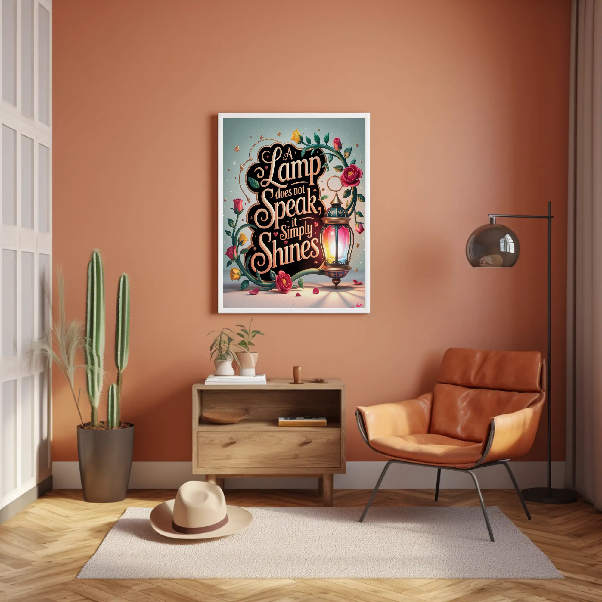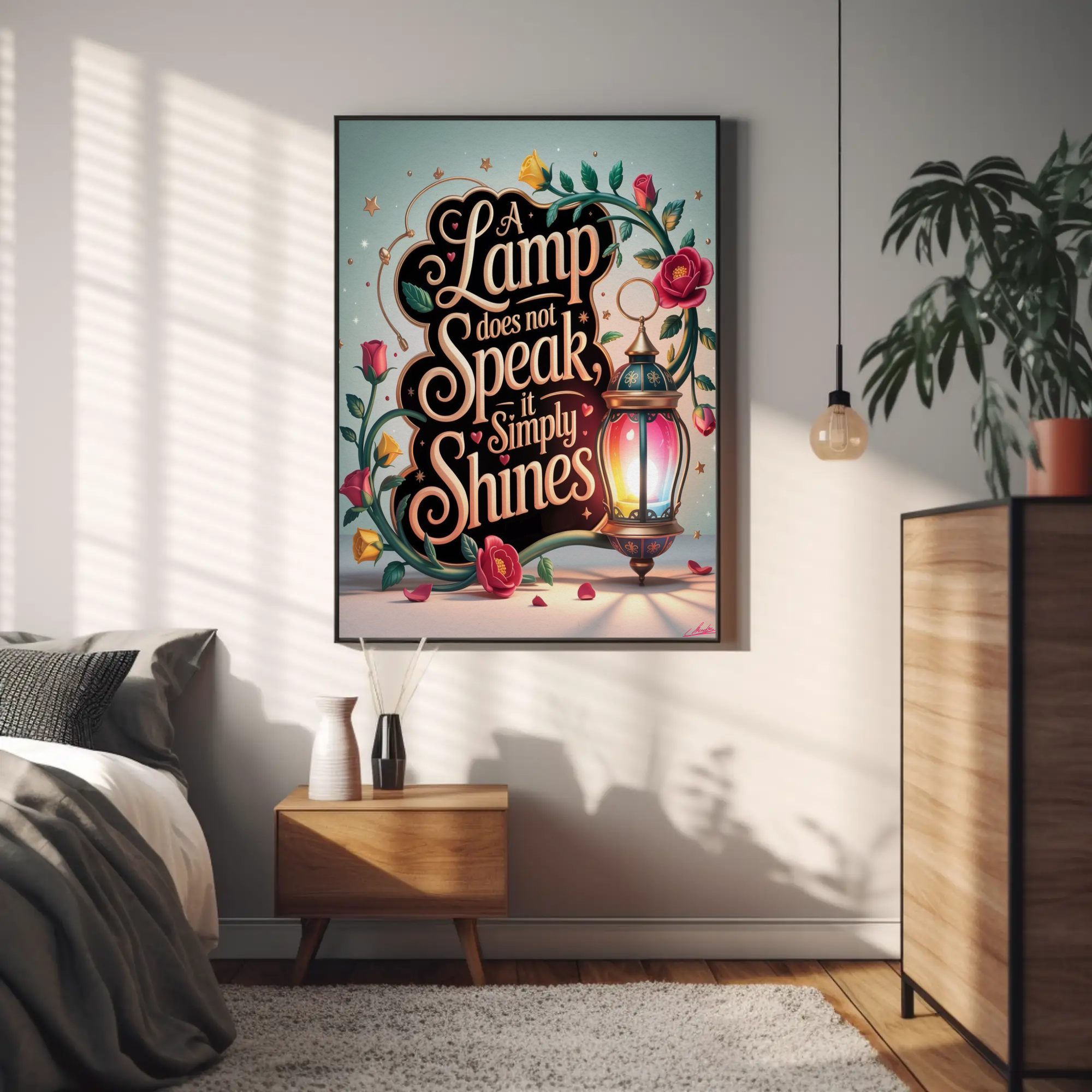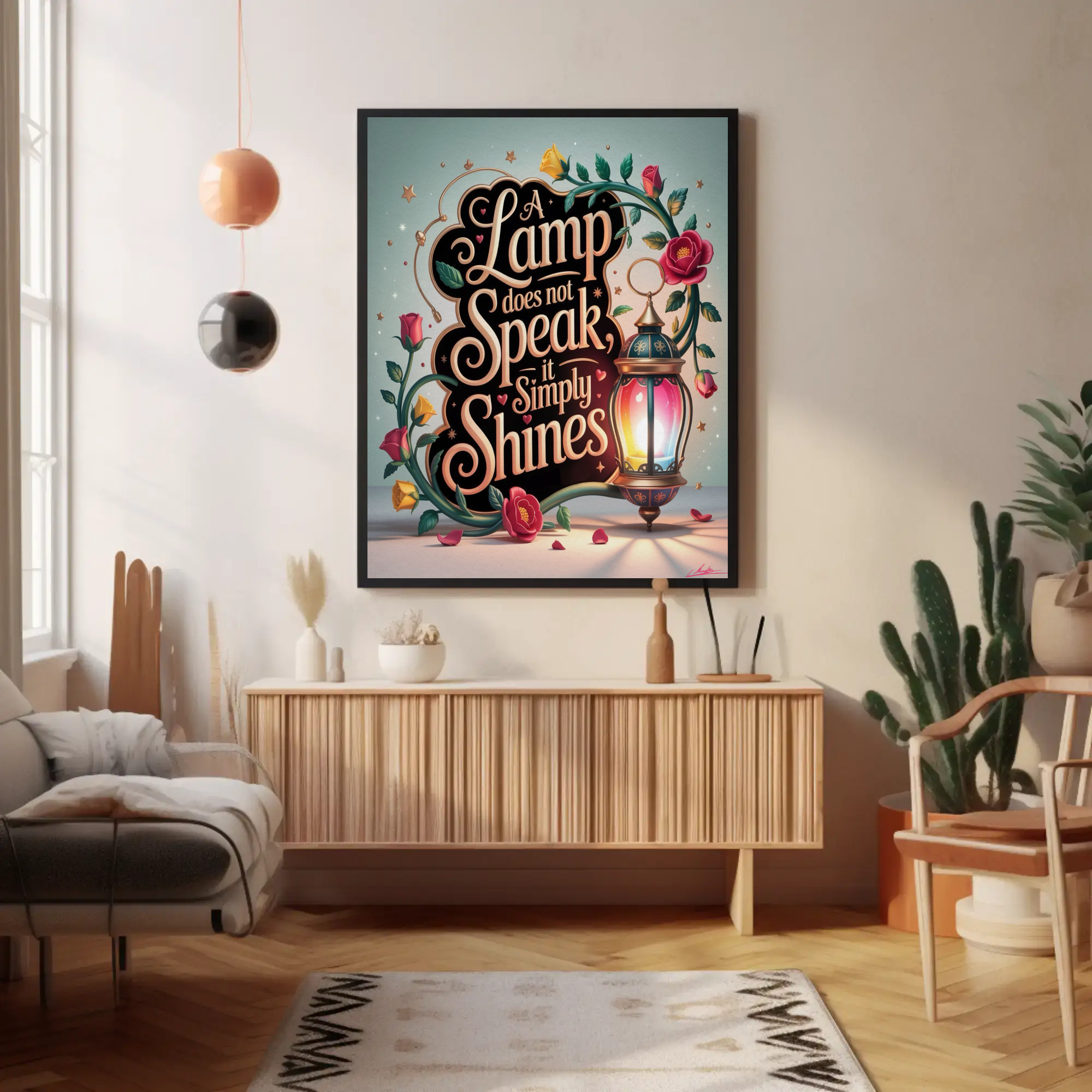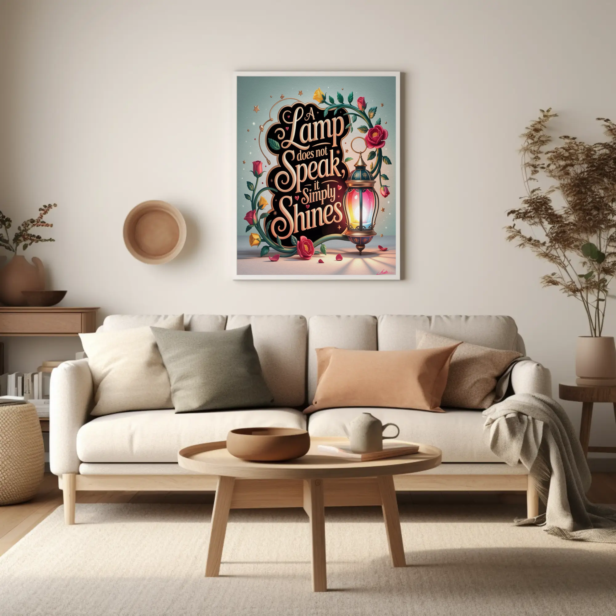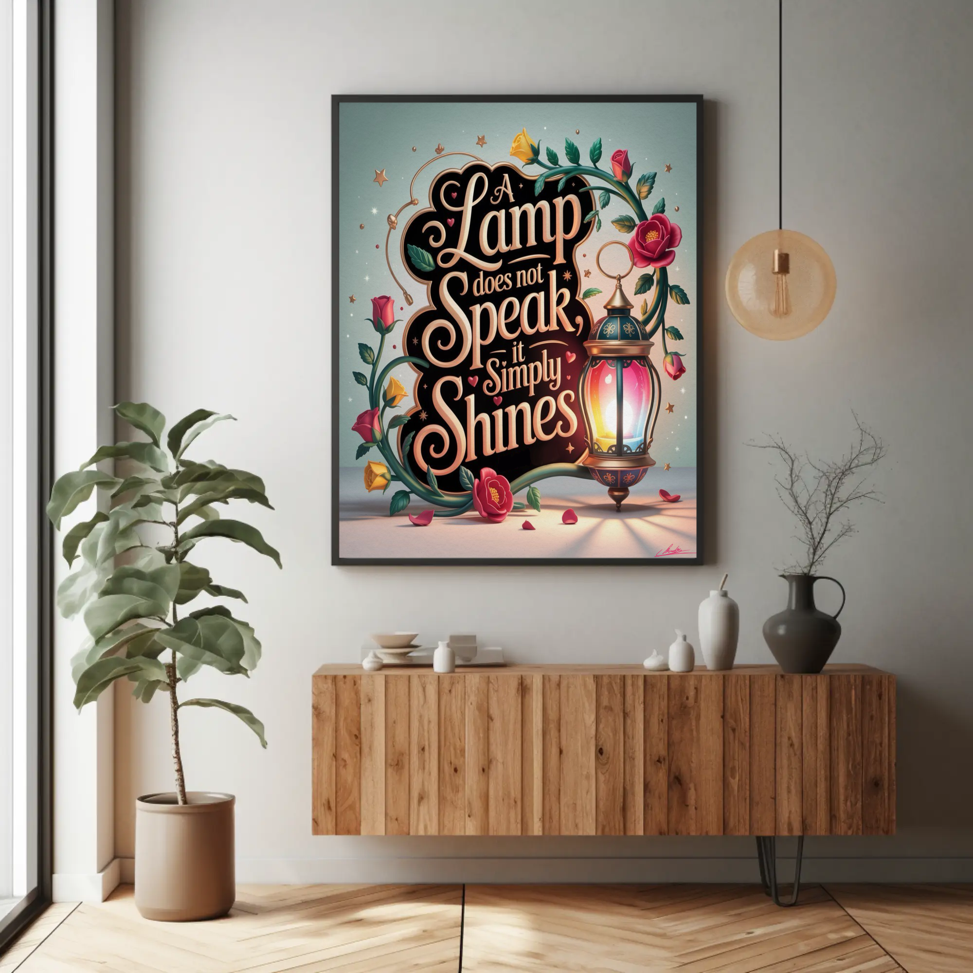 Bring elegance and inspiration into your home with this minimalist yet powerful wall art: “A Lamp Does Not Speak — It Simply Shines.”