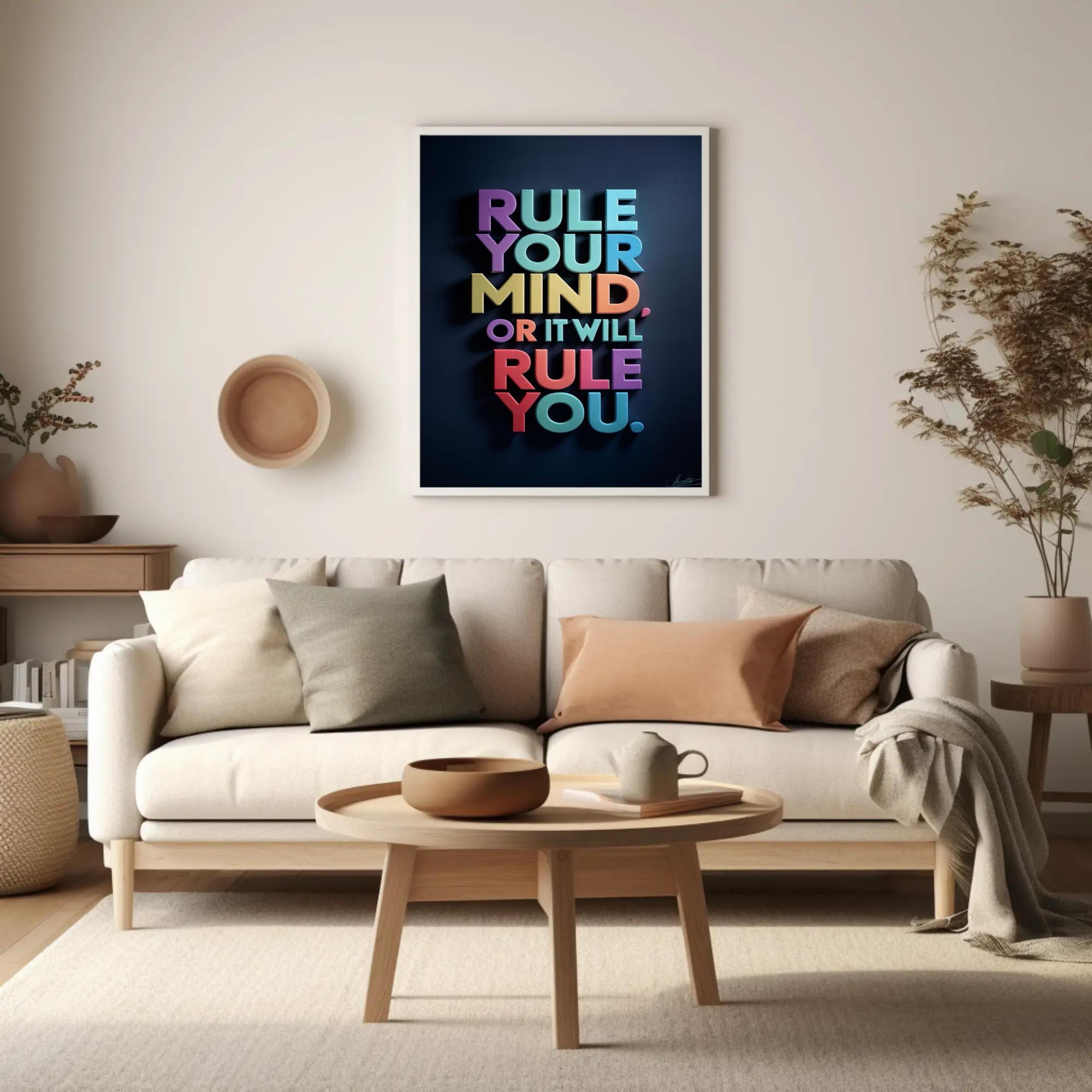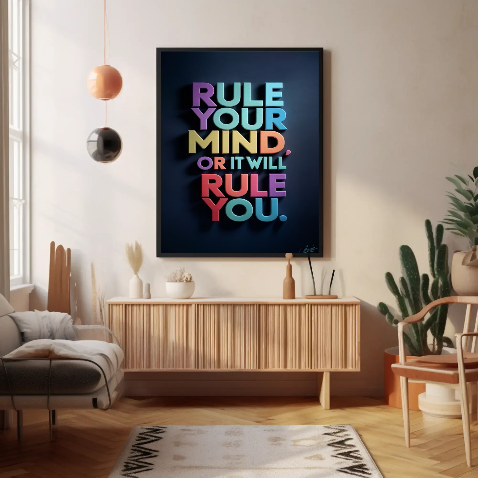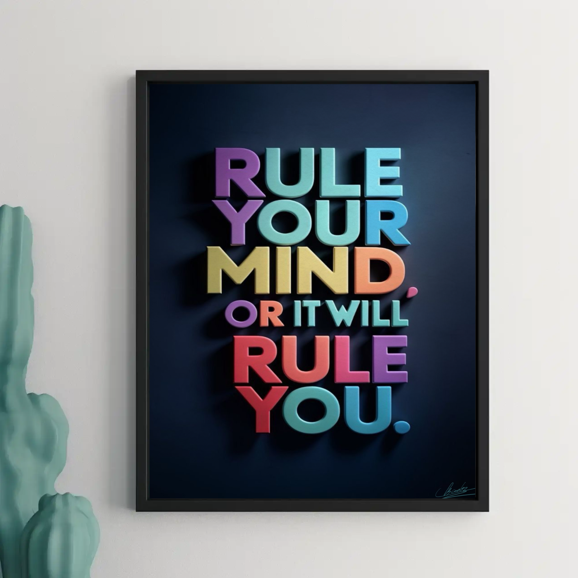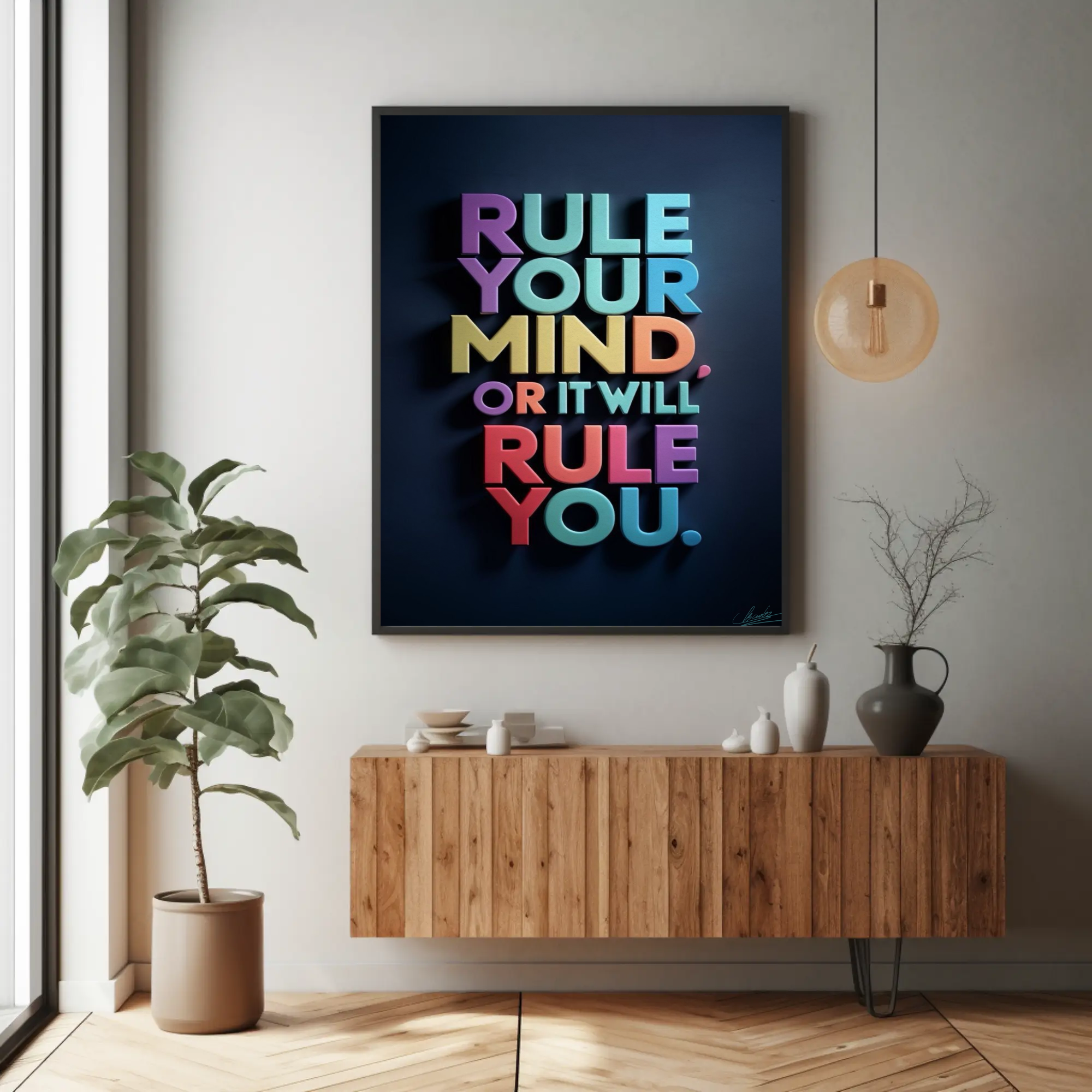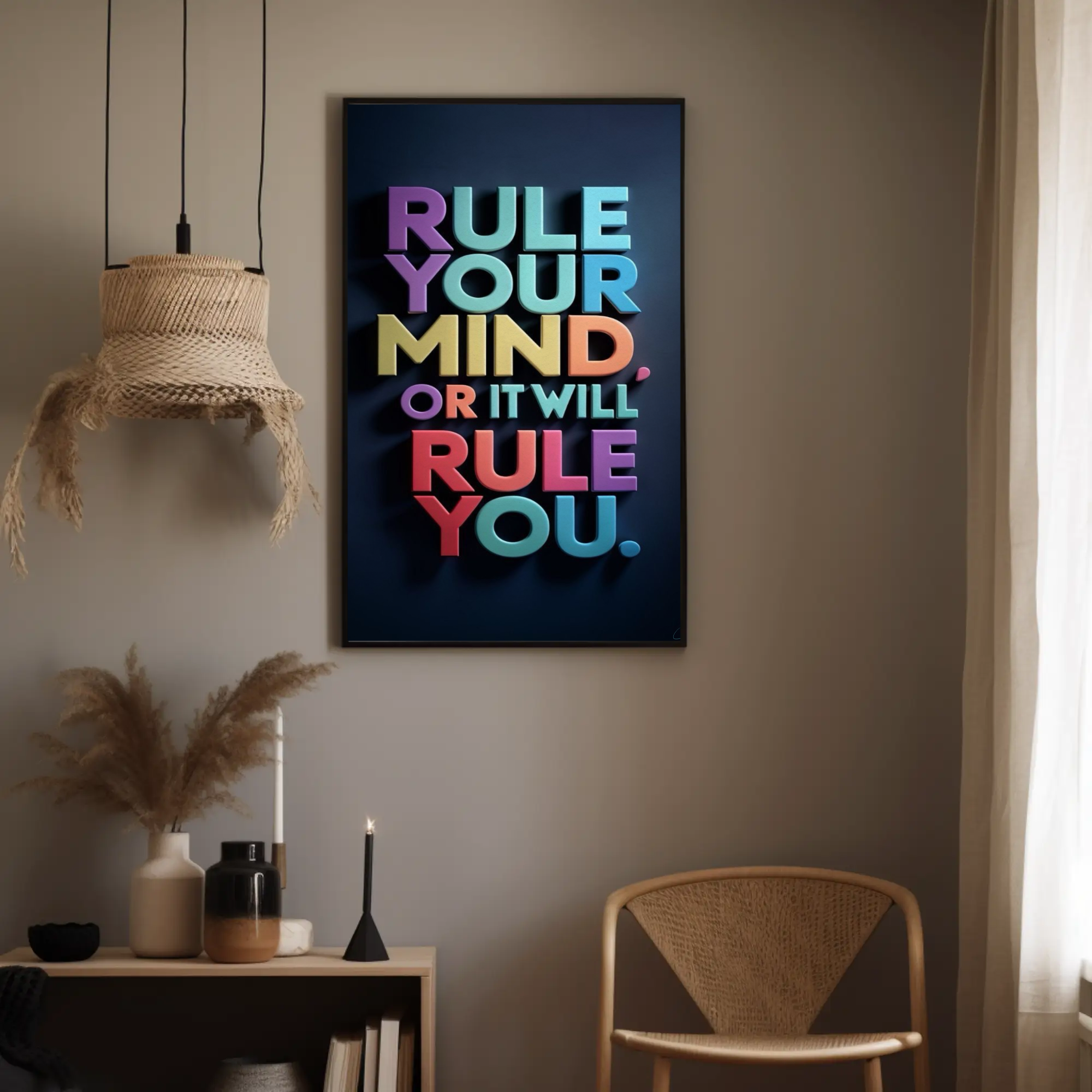 Your mind is a powerful tool—when you rule it, you can achieve anything. “Rule Your Mind” is more than just a piece of art; it’s a call to action. Featuring strong typography and a minimalist design, this artwork serves as a daily affirmation to encourage mental discipline and focus.